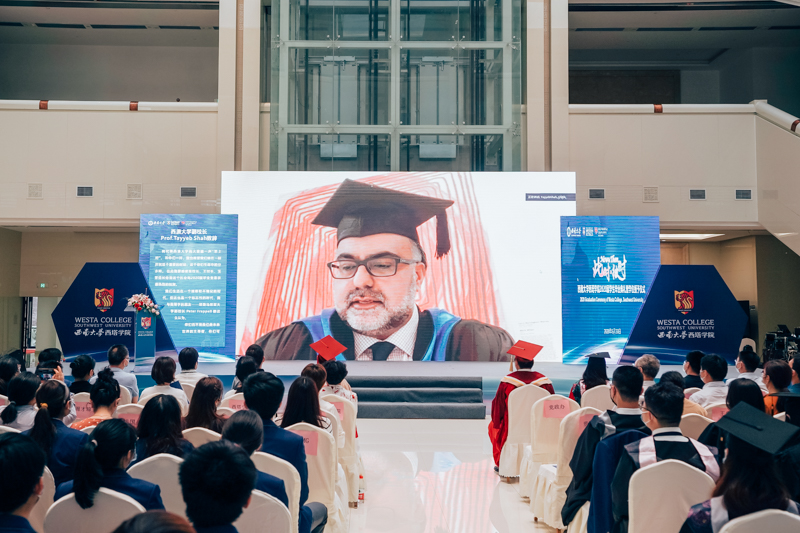 西澳大学副董事长Tayyeb Shah教授同样通过网络向西塔毕业生们表达了祝贺。他提到,在这个充满艰难和未知的时代,西塔学子们展现了面对逆境时的勇气、韧性、理解力和适应能力,而这些经历都将成为未来发展的坚实基础。Tayyeb教授对中国在疫情下的相关举措表示赞赏,也对西塔作为合作伙伴表达感谢。最后,他引用纳尔逊•曼德拉的话寄语三校合作,“教育是改变世界最有力的武器”。