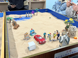 Part3:挑选了玩具后,沙盘游戏正式开始。在每一轮游戏中,同学们可选择将挑选的玩具放在沙盘中自己心仪的位置,或是摆弄沙盘中的沙子,垒起小山或开辟河流。在这个过程中,每个人都可以用心感受自己的选择以及其他成员的摆放所带来的变化。
