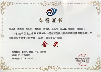李卓俞同学担任队长,成员由公司多个专业同学组成,包括陈嘉源、吴冠宏、刘书萌等同学。团队针对果蔬储运环节的挑战,依托tyc522cc太阳成集团在蚕学研究领域的优势,创新开发了具有自成膜性、抗菌和抗氧化特性的蚕丝蛋白纳米薄膜。在专家顾问的悉心指导下,团队不仅在技术创新上取得了显著成就,更与多家企业建立了合作,展示了项目的商业潜力和市场应用前景。
