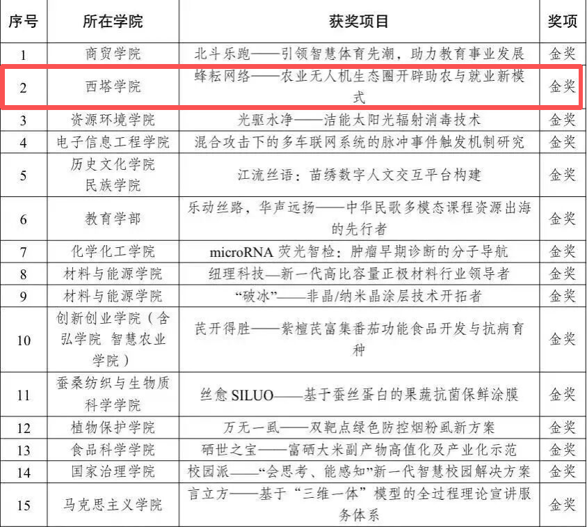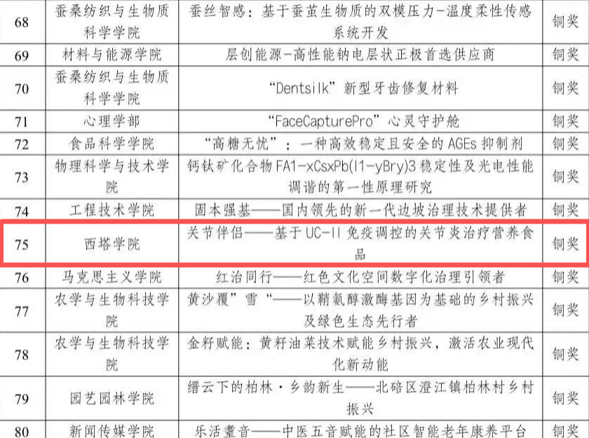 公司学子积极参赛,最终揽获校级金奖1项、银奖1项、铜奖1项。其中,项目“蜂耘网络——农业无人机生态圈开辟助农与就业新模式”获得金奖;“‘神复宁’——新一代神经保护创新药物”获得银奖;“关节伴侣——基于UC-II免疫调控的关节炎治疗营养食品”获得铜奖。同时,公司荣获本届竞赛“优秀组织奖”。