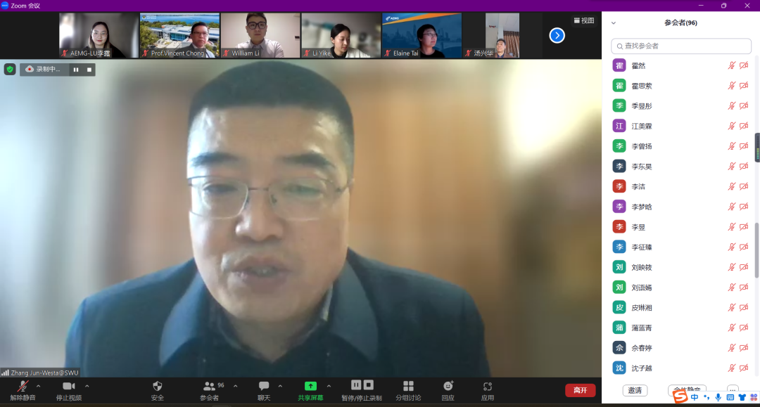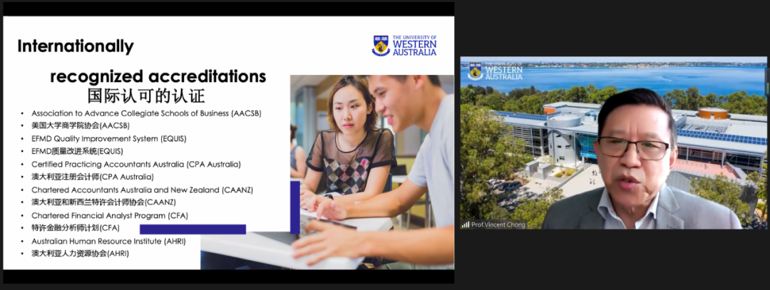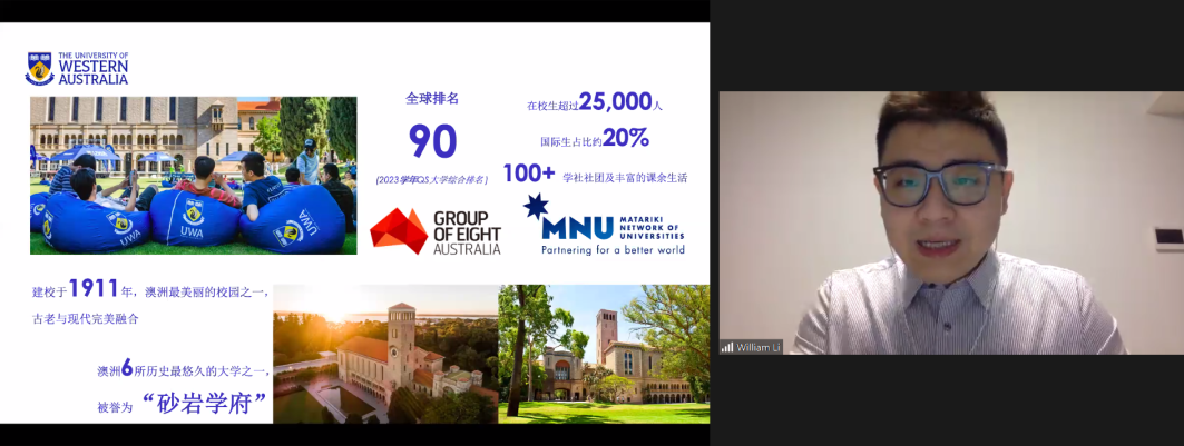 11月25日下午,公司2020级3+2项目出国宣讲会在线上顺利举行。本次活动邀请了西澳大学商公司会计与金融学Vincent Chong教授、分子生物科学公司高级讲师Alyssa Van Dreumel博士、西澳大学华南区域负责人William Li先生,太阳成集团tyc522cc副经理张俊、国际项目管理办公室以及2020级经济学、生物技术专业全体同学及部分家长参会。