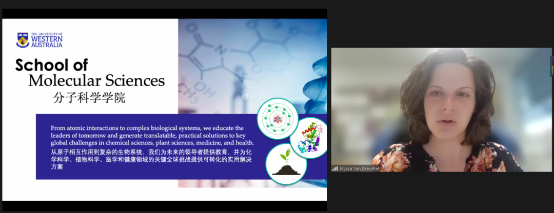 William为员工们展示珀斯优美的城市环境、西澳大学美丽的校园环境以及先进的实验室设施。Vincent Chong教授介绍商公司历史、发展、学术成就等内容,他强调3+2培养模式是合作办学质量提升的重要内容,能够为员工提供优质的教学资源、合理的学业规划以及宽广的国际视野。Alyssa Van Dreumel博士介绍了分子科学公司以及生物技术专业3+2培养模式,就本专业科研实力、就业前景、团队力量、实验室条件等方面进行说明。