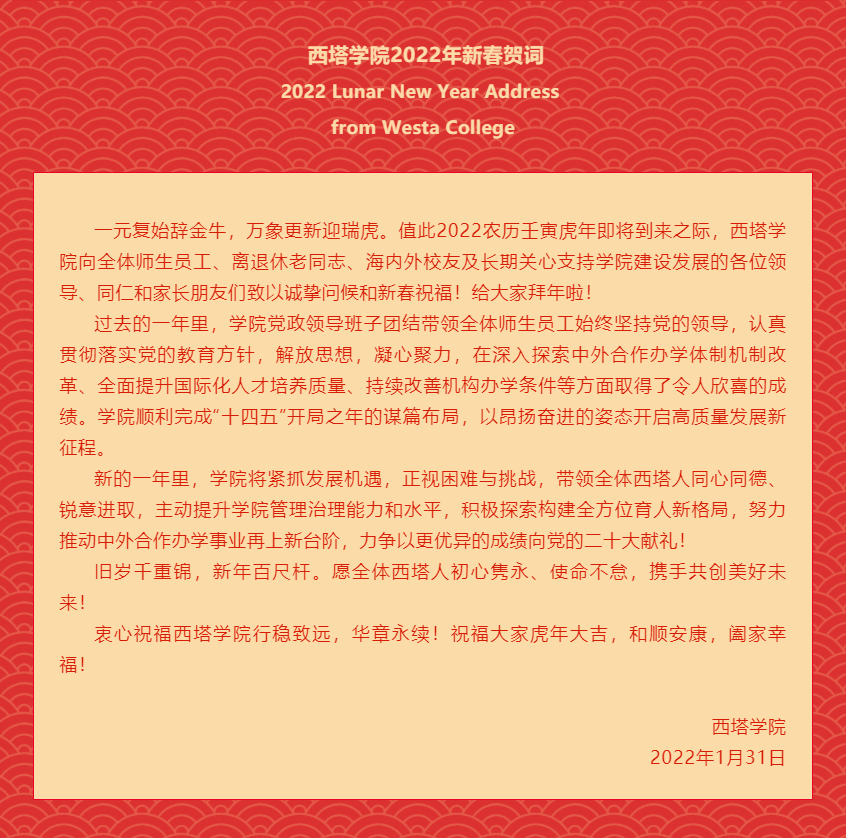 太阳成集团tyc522cc2022年新春贺词 | 2022 Lunar New Year Address from Westa College