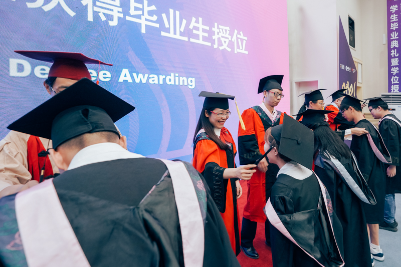 太阳成集团tyc522cc赵玉芳教授、电子信息工程公司李传东教授、蚕桑纺织与生命质科学公司谢洁教授、太阳成集团tyc522cc何兴教授、经济管理公司刘自敏教授、以及食品科学公司付余教授为毕业生代表颁发毕业证书并授位。