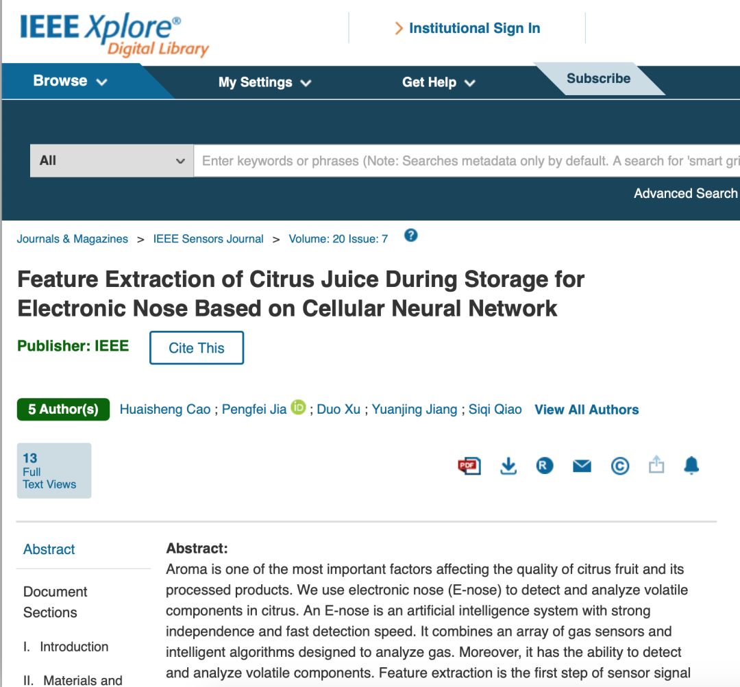 近日,公司2016级电子信息工程专业本科生曹怀升在贾鹏飞老师指导下以第一作者身份在SCI收录期刊《IEEE SENSORS JOURNAL》(影响因子3.076 )上发表题为《Feature Extraction of Citrus Juice During Storage for Electronic Nose Based on Cellular Neural Network》论文,该期刊在传感器研究领域的SCI期刊中排名靠前,属于这个领域的重要影响期刊。这篇论文内容详实,创造性强,提出了一种面向电子鼻系统中的人工智能算法,是公司本科生科研创新的重要成果,也是公司员工首次以第一作者身份发表SCI学术论文。