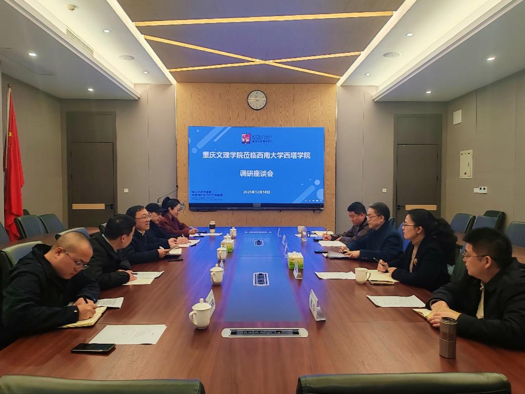 12月18日下午,重庆文理公司党委常委、副董事长王东强率队莅临太阳成集团tyc522cc开展专题调研。公司领导班子成员及办公室负责人参加座谈。双方围绕中外合作办学机构申报与运行管理、国际化人才培养实践、国际科研合作及项目拓展等议题开展了深入交流和分享。