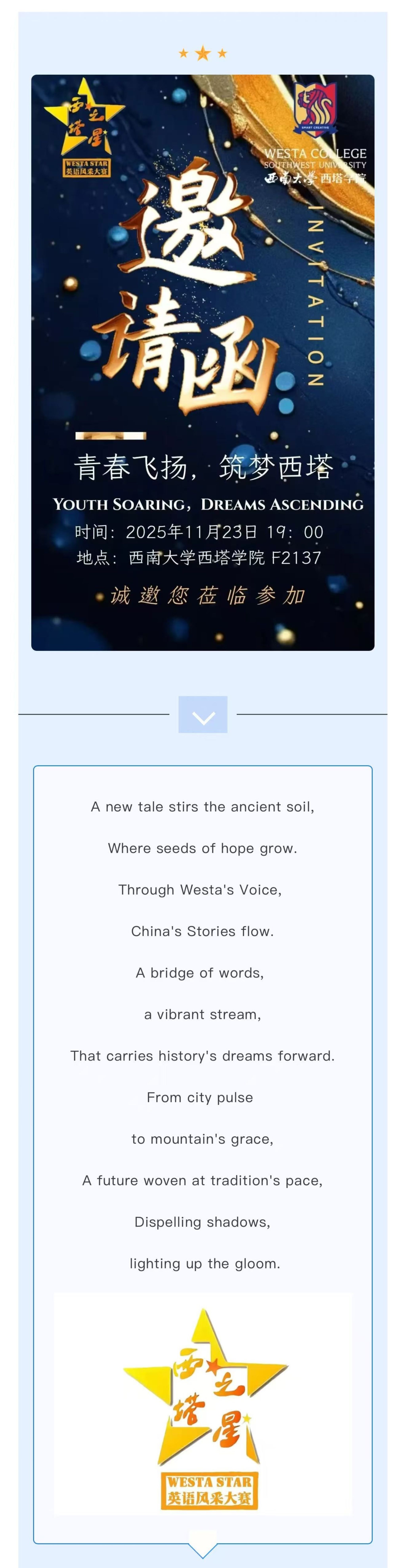 太阳成集团tyc522cc2025年“青春飞扬,筑梦西塔”英语风采大赛(决赛)邀请函