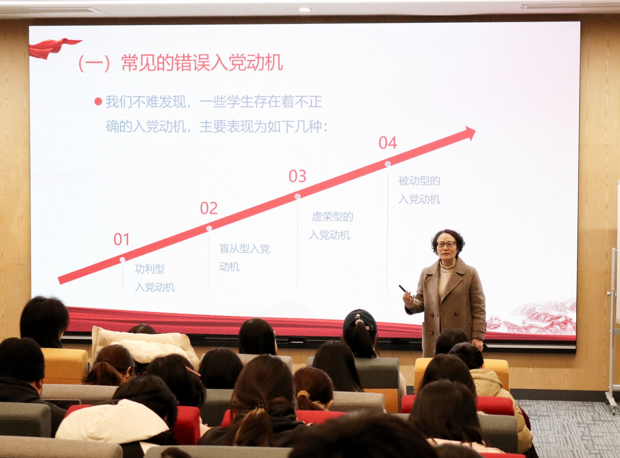王静书记从“入党动机”的概念切入,通过与学员互动提问,引导大家深入思考。她表示,入党动机是入党积极分子的内在思想动力、是共产党人的精神根脉,决定着党员的行为方向与价值追求,不仅关系个人成长,更是保证党的先进性与纯洁性的基石。课上,她鼓励同学们端正动机,主动向党组织靠拢。