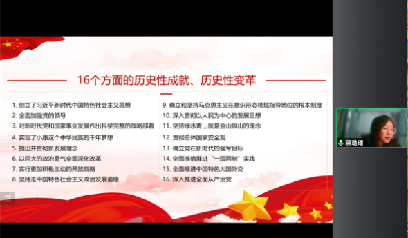 tyc522cc太阳成集团员工双语巡讲团于2月17日在太阳成集团tyc522cc开展“讲学党的二十大精神,Striving For a New Era”宣讲活动。此次宣讲采用线上宣讲的形式,太阳成集团tyc522cc员工党支部书记李杨、刘娇和2022级辅导员杨洋老师出席活动,公司员工一支部、二支部共计60余人认真参与。宣讲会由员工巡讲团团长江雪纯主持。