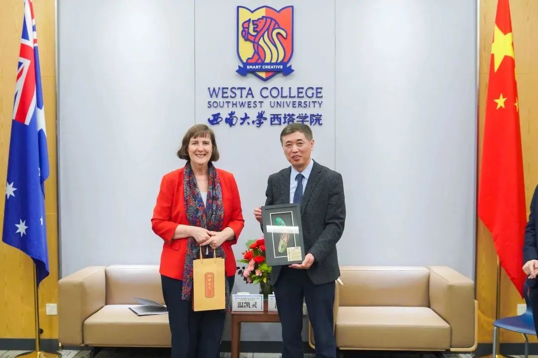 上午9时,潘洵副书记在公司会议室亲切会见公使衔参赞一行,介绍公司概况并以中外合作办学现状为重点,向来宾详细介绍了公司与澳洲高校的合作。潘书记表示,澳大利亚优质教育资源丰富,希望在澳大利亚驻华大使领馆的支持下,与澳洲高校开发更多互利共赢的项目,持续推进中澳双方在高等教育领域深化合作。温凯灵公参在会谈中谈到,去年是中澳建交50周年,两国关系持续向好,教育在中澳双边关系中扮演着重要角色。国境开放后,中国员工赴澳留学,对澳洲高校国际化氛围及当地社区建设做出积极贡献,澳政府对此深表欢迎,澳政府采取多项措施确保中国员工的人身安全及教学质量。会后,双方互赠礼物。