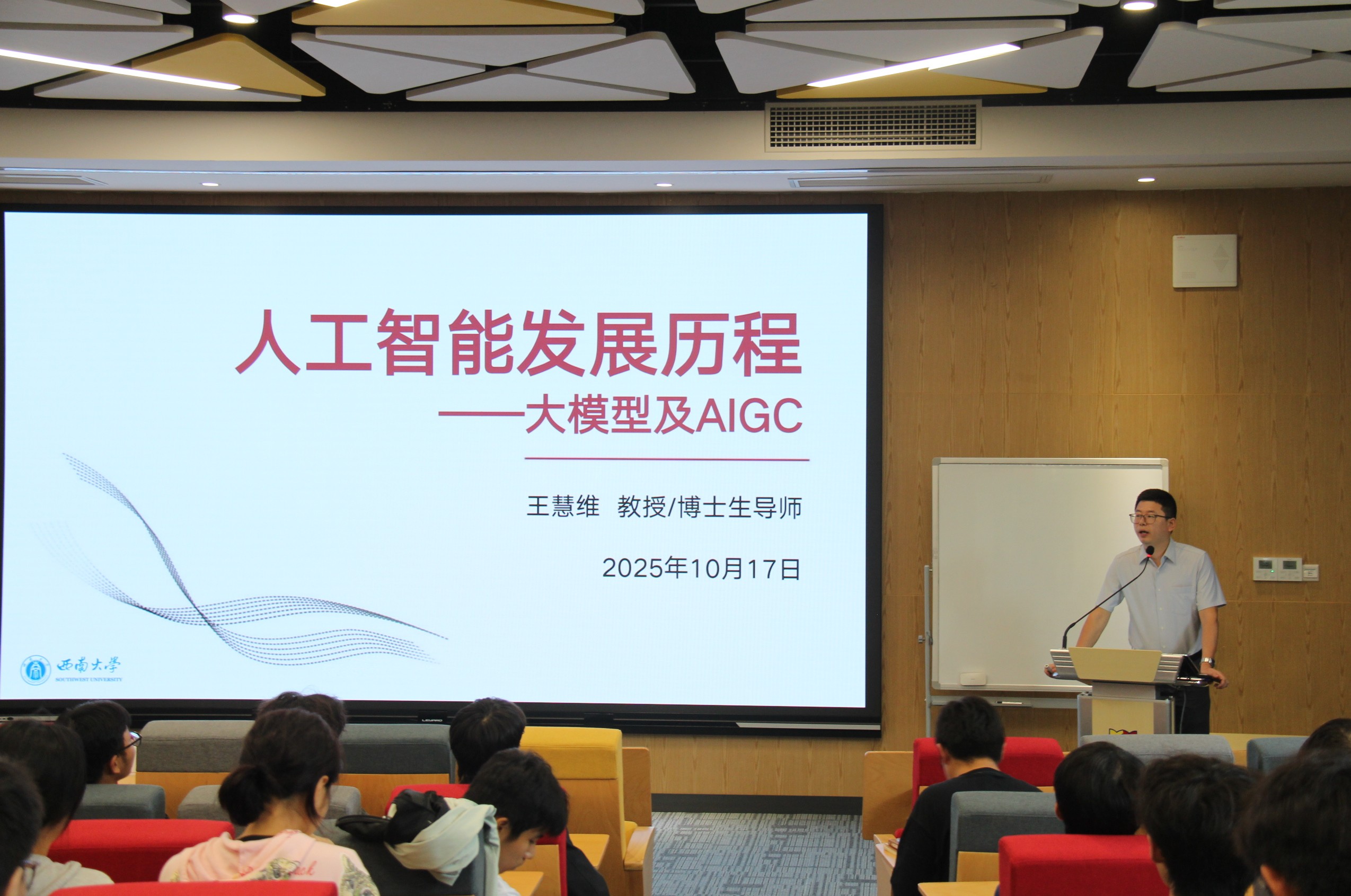 在电子信息工程专业专场讲座上,王慧维教授以“人工智能发展历程——大模型及AIGC”为主题,从人工智能的理论基础、技术发展及应用展望等方面进行深入解析。他首先系统介绍了人工智能的定义与历史演进;随后,围绕人工智能的发展历程与三类实现人工智能的不同技术路线,分享了对于人工智能不同发展时期和智能水平分化的独特见解,讲解了主流智能模型与技术方法,分析了卷积神经网络(CNN)、循环神经网络(RNN)及其变种(LSTM)三者之间的差异和各自特点;并以大模型的实现原理为导入,探讨了大模型如何通过海量数据训练获得“智能涌现”,以及AIGC在文本、图像、代码、音视频等领域的惊人创造与应用前景;同时,他也指出了人工智能所面临的数据隐私安全风险及伦理规范问题等挑战,强调需冷静审视其带来的技术伦理、社会影响与未来挑战。